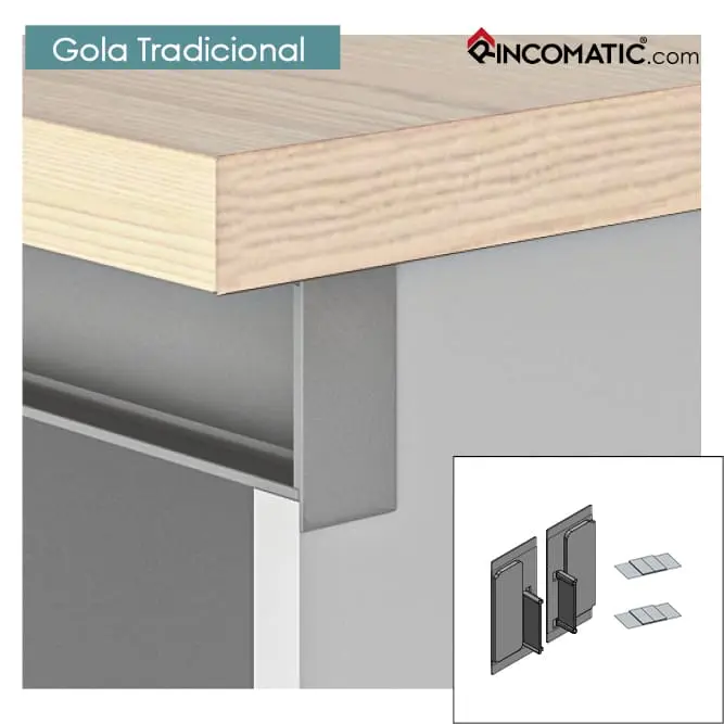 El sistema de Perfil Rincomatic Gola Tradicional proporciona un estilo moderno de líneas cuidadas y minimalistas. No necesita de la colocación de tiradores, obteniéndose una cocina de estética muy limpia.